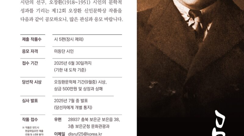 오장환의 시 정신이 다시금 신인 작가들의 붓끝에서 되살아날 이번 공모전은, 한국 현대문학의 뿌리를 돌아보며 미래를 함께 그려보는 계기가 될 것으로 기대된다.