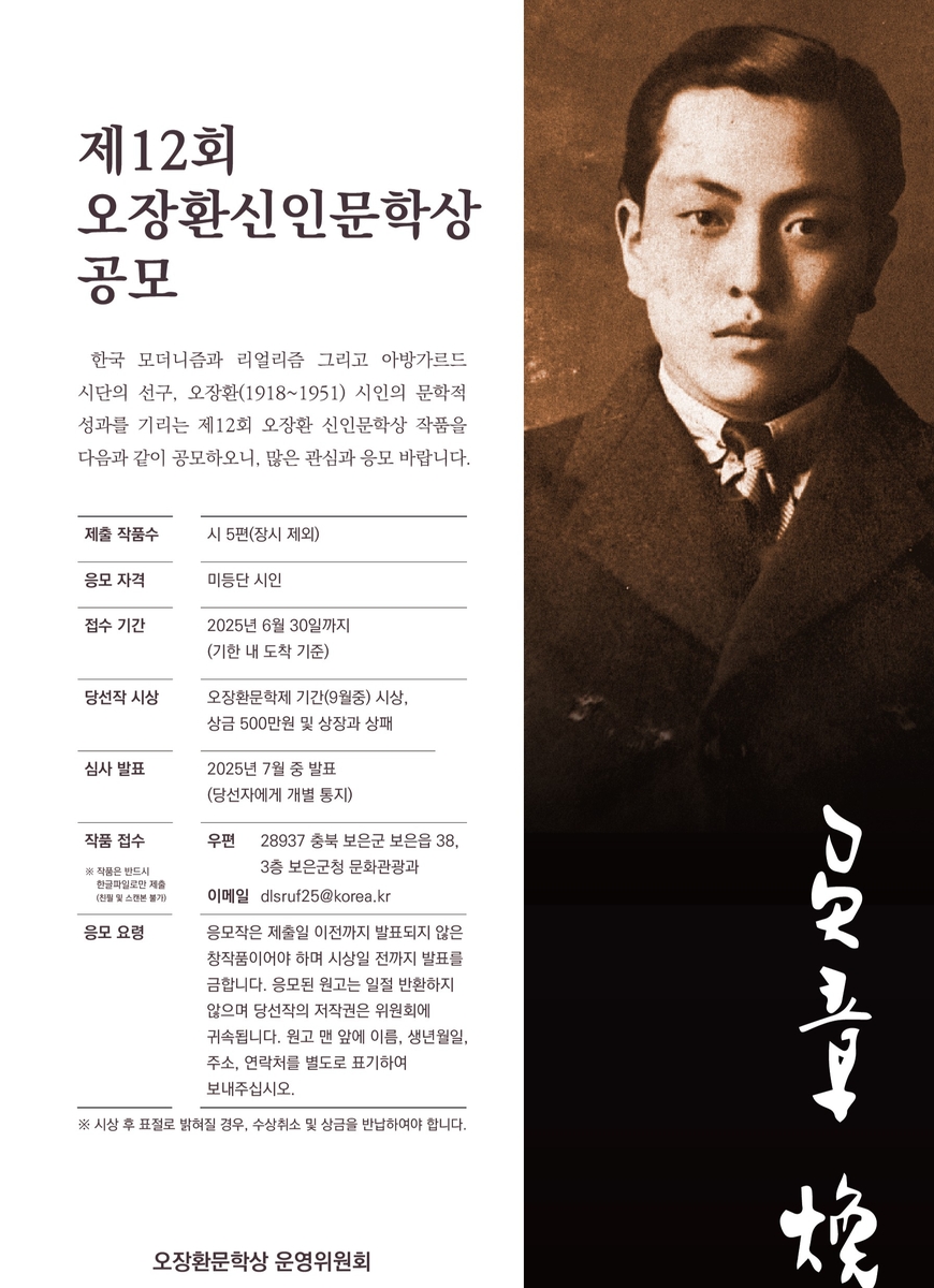 공모 대상은 한 번도 문단에 발표된 적 없는 창작 시로, 개인당 최대 5편까지 제출할 수 있다. 접수는 보은군청 문화관광과를 통해 진행되며, 당선작은 오는 9월 열릴 예정인 오장환 문학제에서 공개 시상된다. 당선자에게는 500만 원의 상금이 수여된다.