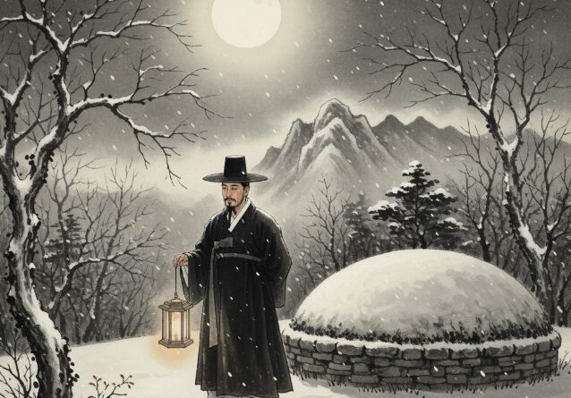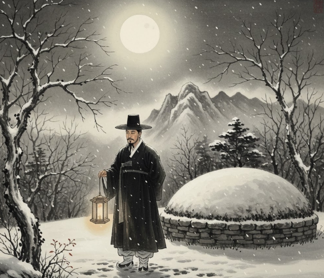 조선의 겨울밤, 들녘의 달빛 아래에서 한 남자가 무덤을 지켰다.