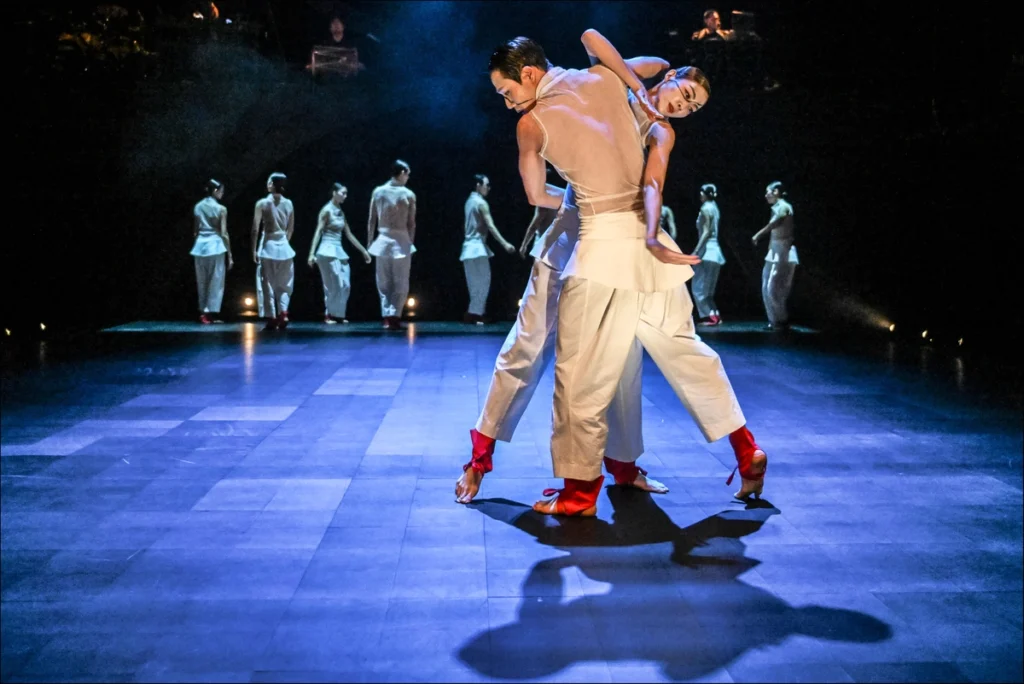 무대는 장단의 구조를 해체하고 재조합하는 방식으로 전개된다. 장구와 타악, 전자음악이 결합된 리듬 위에서 무용수들은 느림에서 출발해 급격한 가속으로 치닫고, 다시 정지에 가까운 상태로 회귀한다. 특히 붉은 LED 조명이 무대를 채우는 장면에서 8명의 무용수가 각기 다른 동작으로 빠르게 질주하는 대목은 인상적으로 남는다. 규칙적인 장단이 깨지며 엇박이 발생하는 순간, 무용수의 움직임은 외부 리듬을 따르기보다 스스로 속도를 생성하는 방향으로 전환된다.