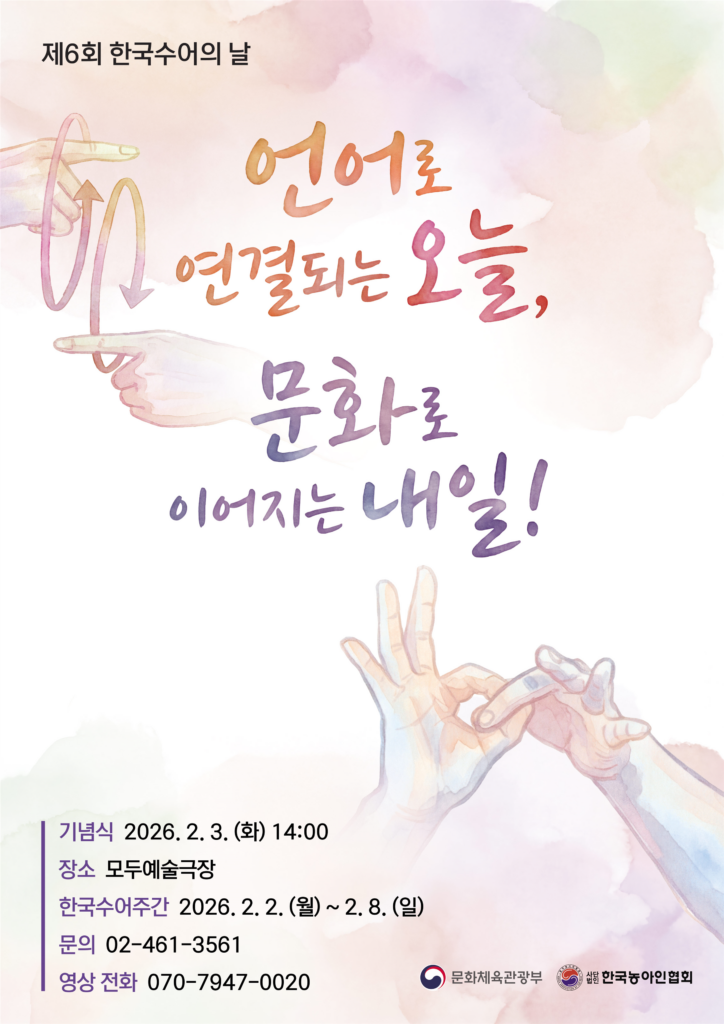 문체부는 2월 3일 오후 모두예술극장에서 ‘제6회 한국수어의 날’ 기념식을 열고, 수어가 지닌 언어적·문화적 중요성을 조명할 계획이다.
