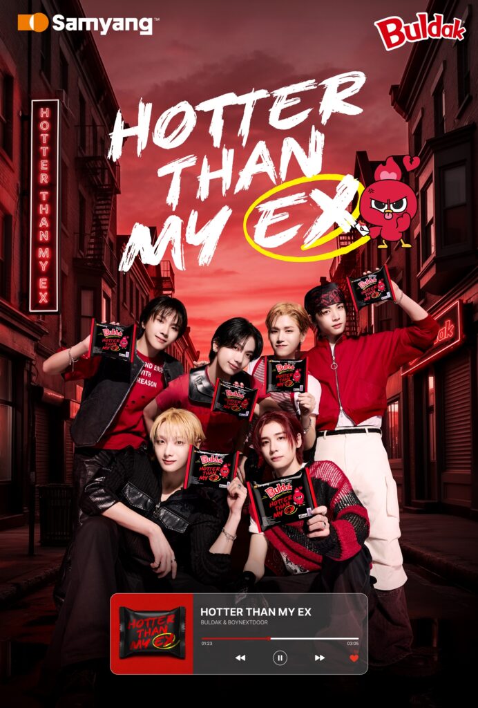 삼양식품은 보이넥스트도어를 신규 글로벌 캠페인 ‘Hotter Than My EX’의 주인공으로 발탁했다고 밝혔다. 이번 프로젝트는 전 세계에서 인기를 얻고 있는 K-팝 그룹과 대표적인 K-푸드 브랜드가 만났다는 점에서 주목된다.