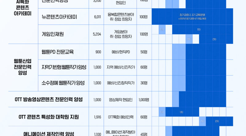 분야별 교육도 확대된다. OTT 방송영상 분야는 넷플릭스와 연계해 현업인 1000명을 대상으로 기획과 후반 작업 교육을 실시한다. 웹툰 분야는 PD와 작가 과정으로 나눠 140명을 양성한다. 애니메이션 제작 45명, 대중음악 120명, 대중문화예술 450명도 포함됐다.