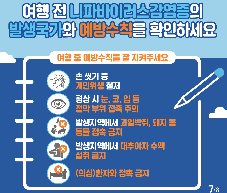 국내에서는 아직 확진 사례가 보고되지 않았다. 질병관리청은 2025년 니파 바이러스를 제1급 감염병으로 지정했다. 치명률이 높고 집단 발병 위험이 크다는 점이 반영됐다.