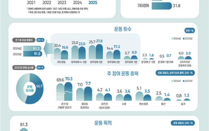 문화체육관광부는 28일 전국 등록 장애인 1만 명(만 10~69세)을 대상으로 실시한 ‘2025년 장애인 생활체육조사’ 결과를 발표했다. 조사에 따르면 주 2회 이상, 1회 30분 이상 운동하는 ‘완전 실행자’ 기준 참여율은 34.8%로 집계됐다. 전년 대비 0.4%포인트 감소한 수치다.